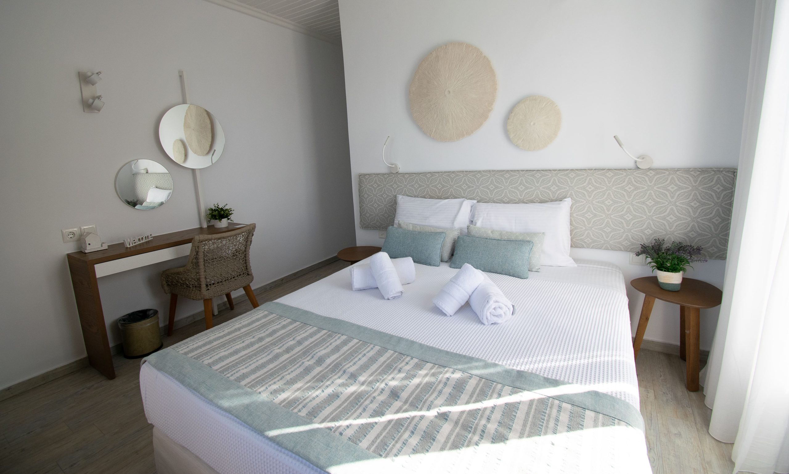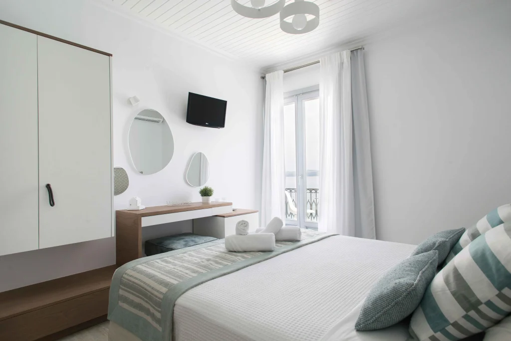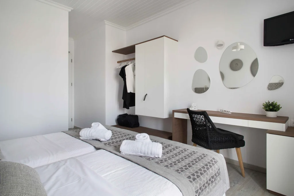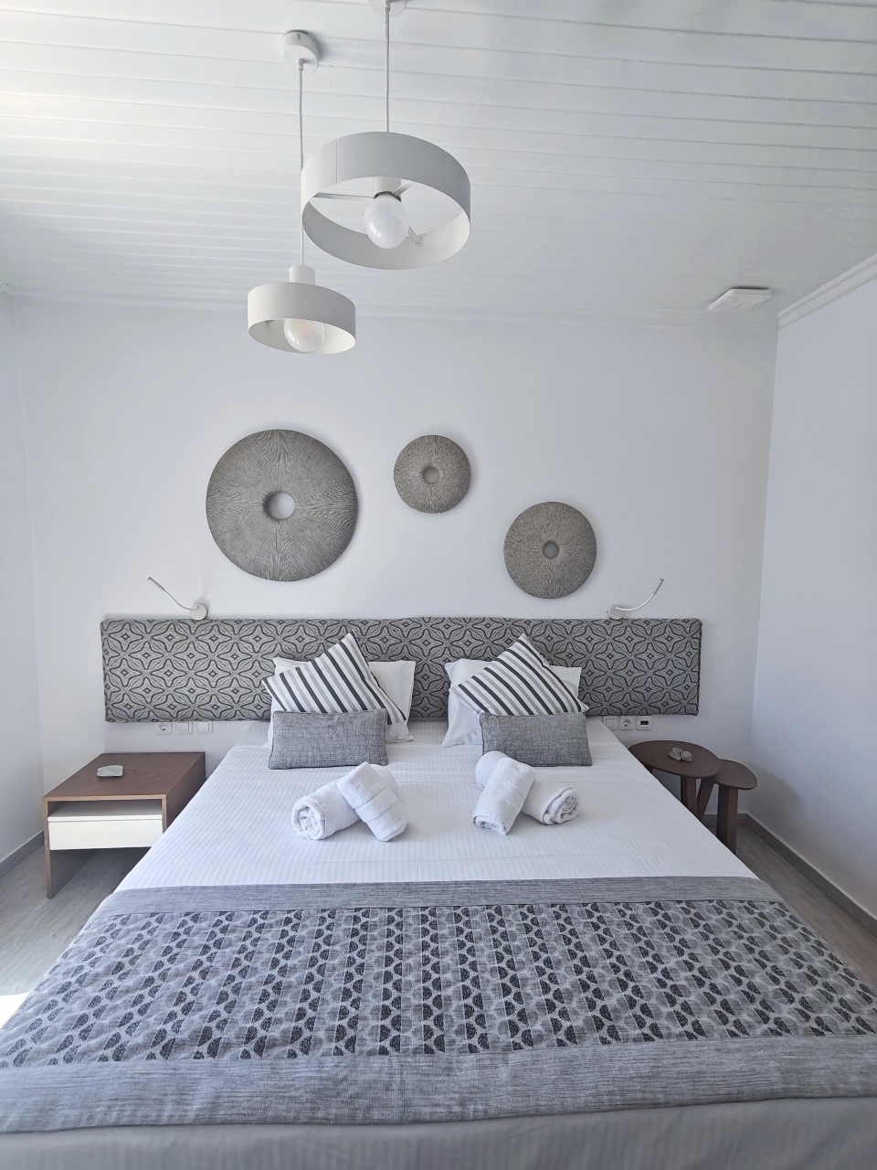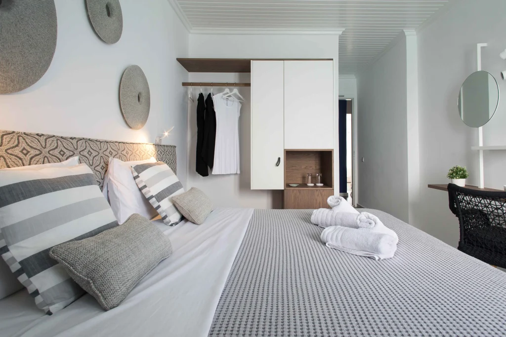 It features a double queen-size bed with anatomical and hypoallergenic mattress and pillows from Media Strom. The space has sound and thermal insulation as well as blackout curtains. The room includes a work space and a bathroom with a shower cabin.