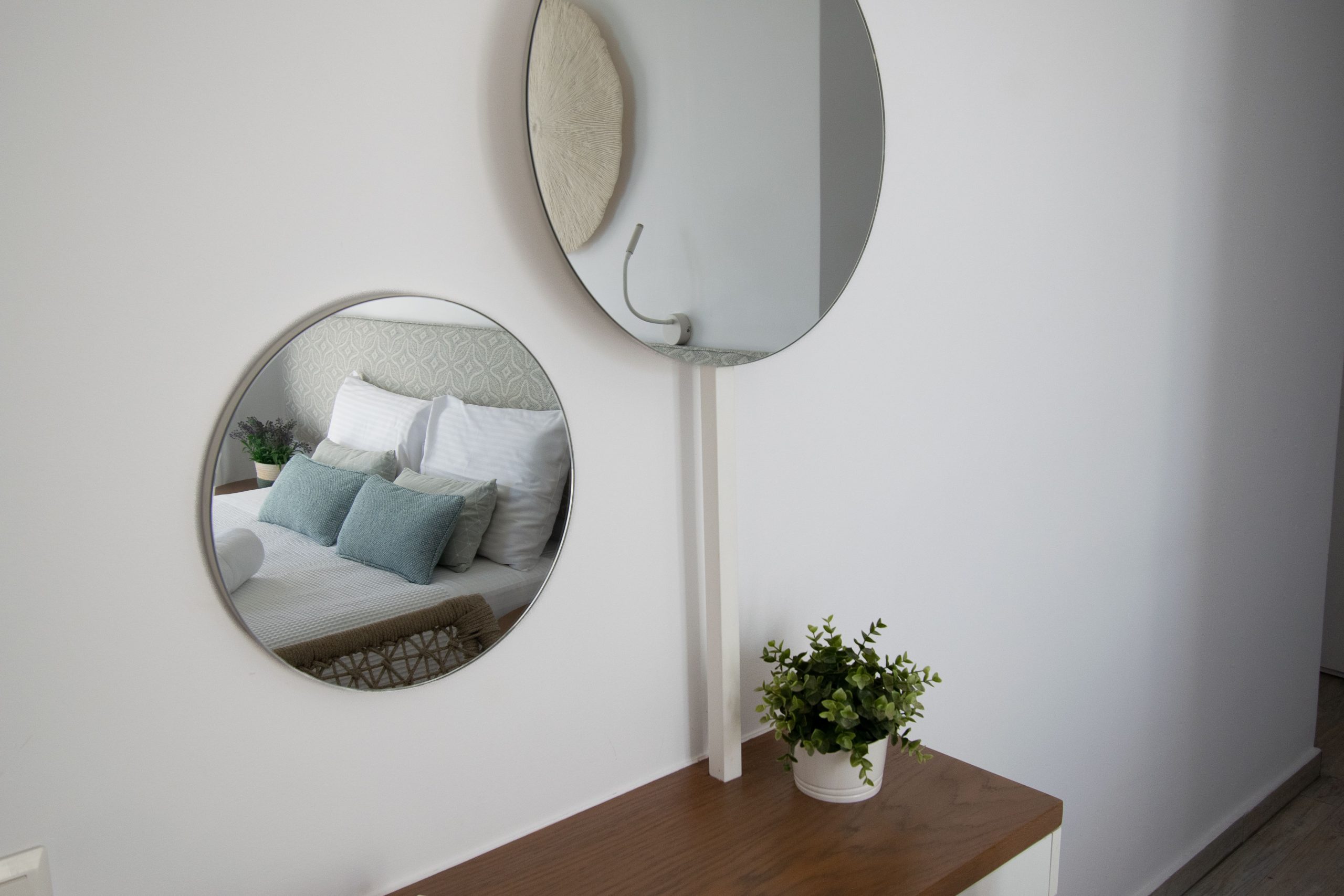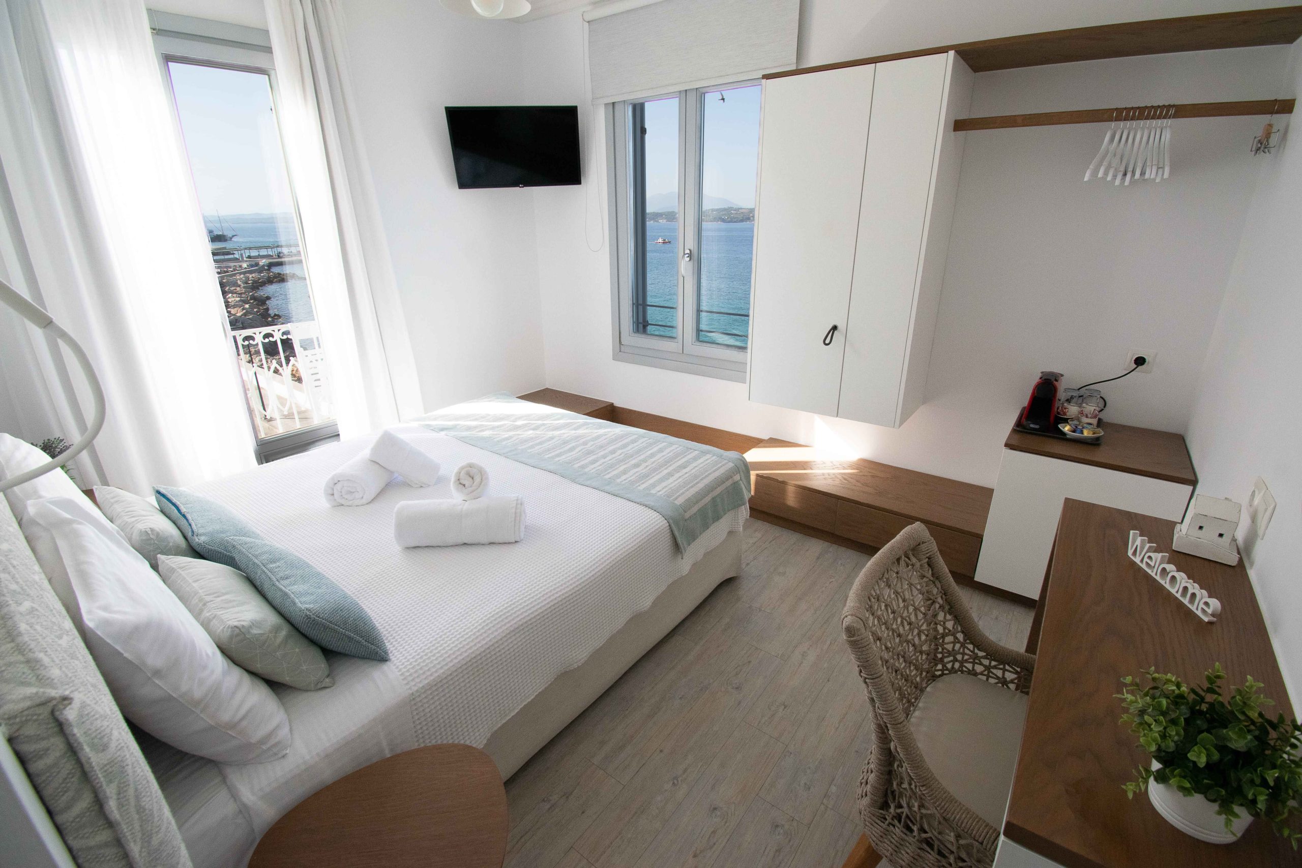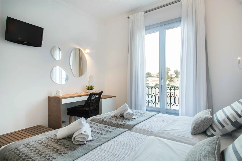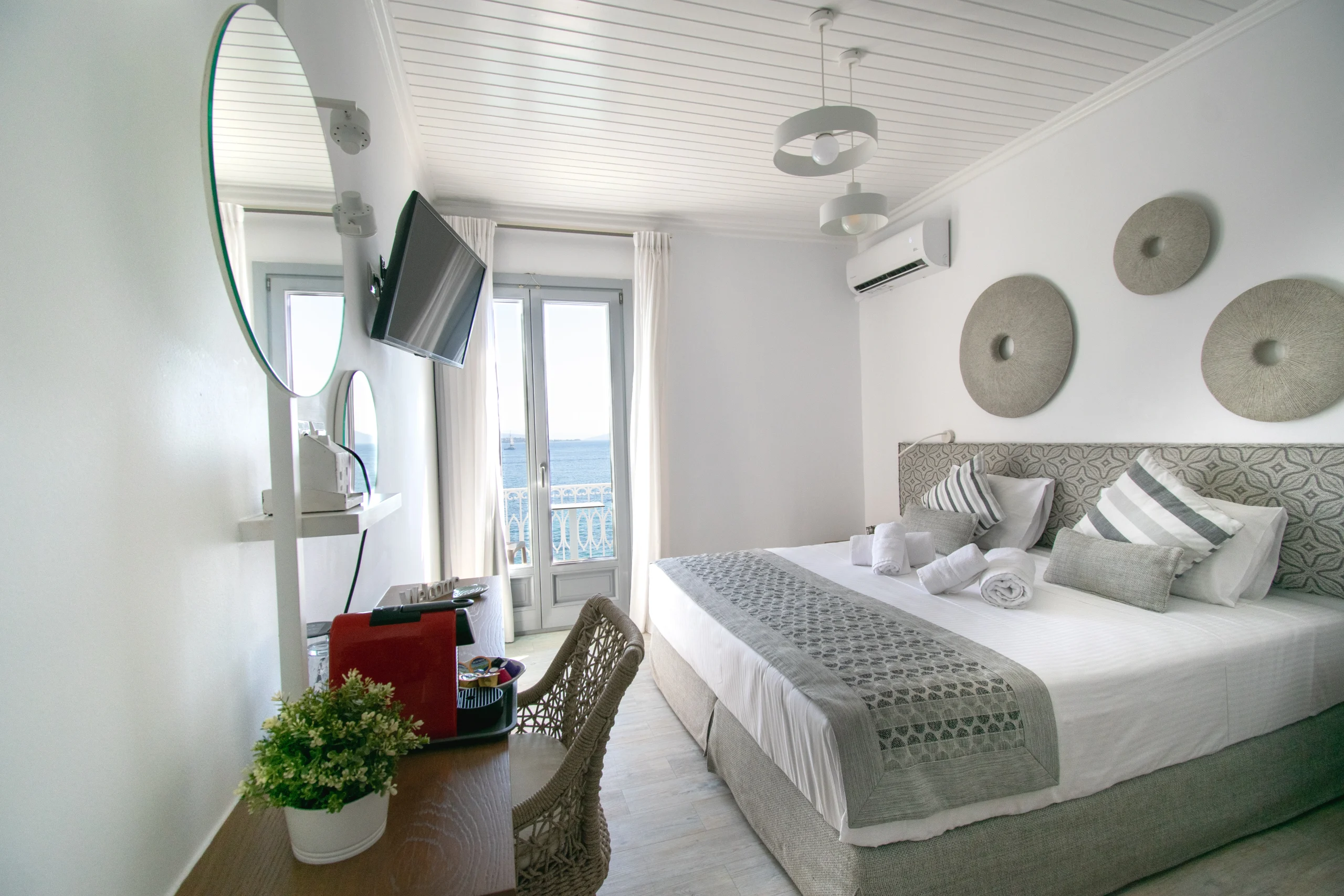 It features a double queen-size bed with anatomical and hypoallergenic mattress and pillows from Media Strom. The space has sound and thermal insulation as well as blackout curtains. The room includes a work space and a bathroom with a shower cabin.