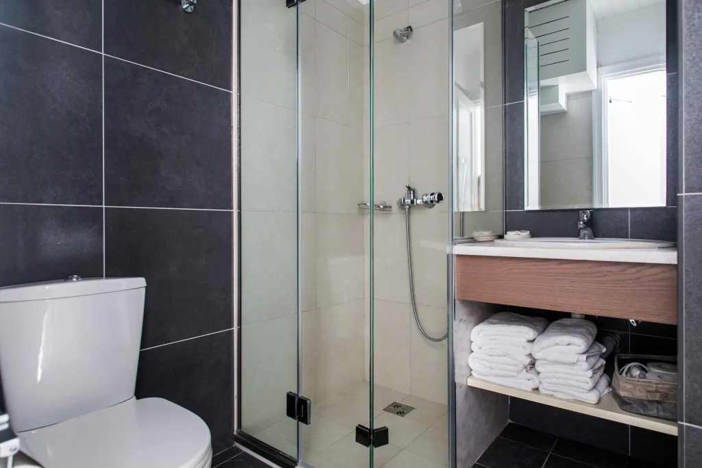 The family suite has all the amenities for the comfortable accommodation of your family! It is tastefully decorated and includes two connecting rooms, separated by a sliding door. One bedroom consists of a double bed (queen-size), while the second bedroom has two single beds, which can be converted into a double bed (king-size). There are anatomical and hypoallergenic mattresses and Media Strom pillows, a workspace, and an armchair.
